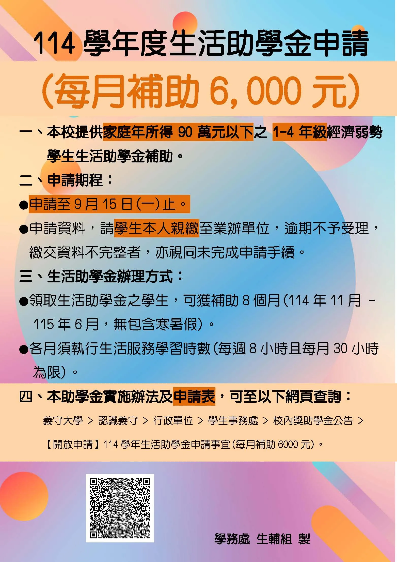 生活助學金申請各位同學好:【單月補助6,000元生活助學金開放申請】 ●申請至9月15日(一)止,申請資料需繳至生輔組。 ●提供「1-4年級」且「具中華民國國籍」之學生申請。 ●若申領「弱勢學生助學金(學雜費補助)」或「就學優待(減免學雜費)」或「行政院減免學雜費」者,亦可同時申請本項生活助學金(生活費補助),兩者申請無衝突。 ●生活助學金申請表,詳如網頁公告:https://reurl.cc/mYX651 海報(圖片).jpg